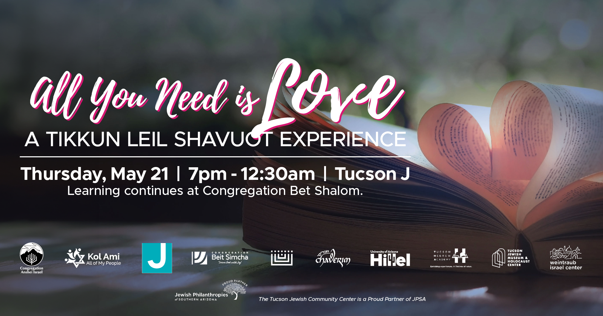 Join us for a Community Shavuot Experience from Thursday, May 21 at 7pm to Friday, May 22 at 4am at the Tucson Jewish Community Center, 3800 E. River Road, Tucson, AZ 85718.
